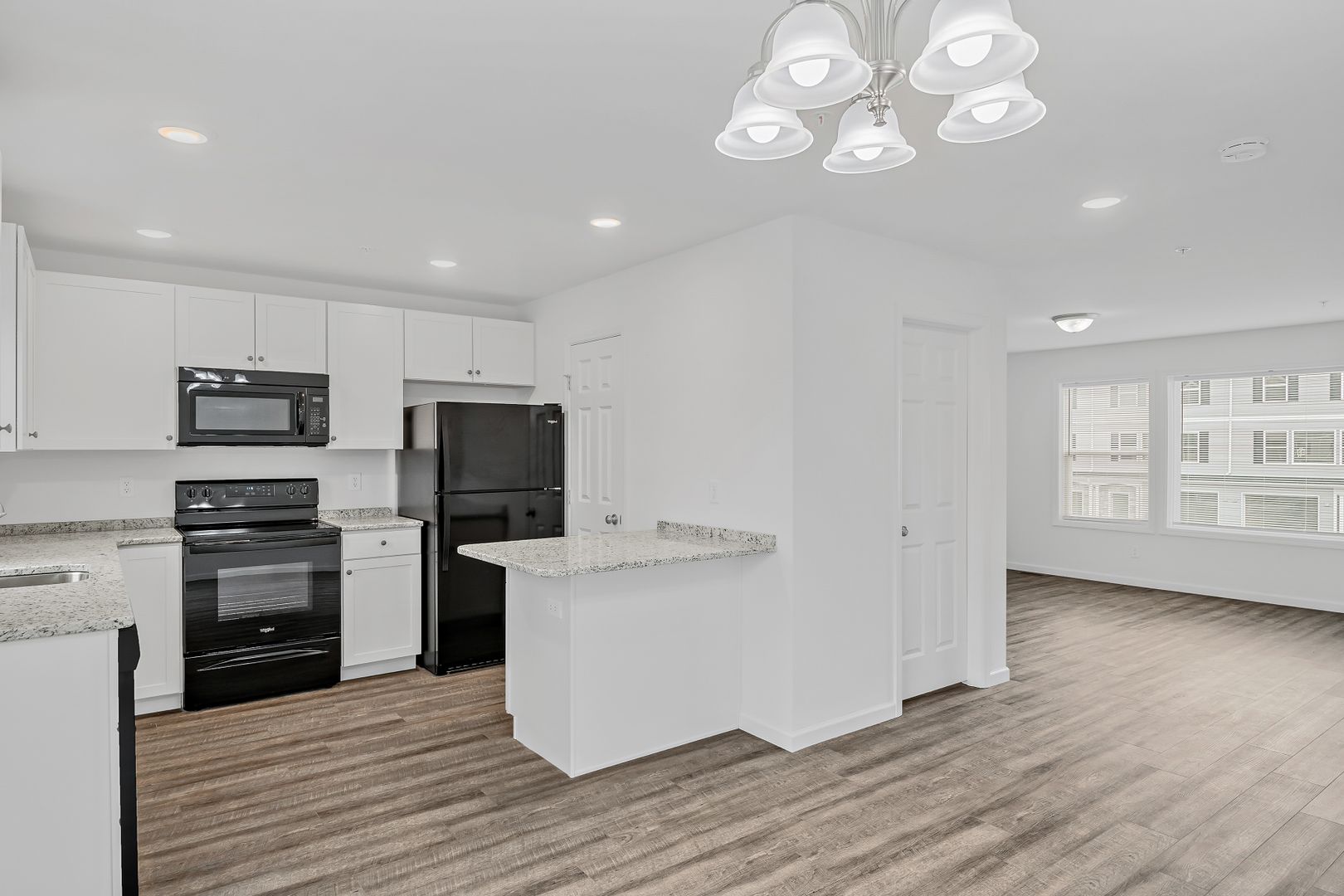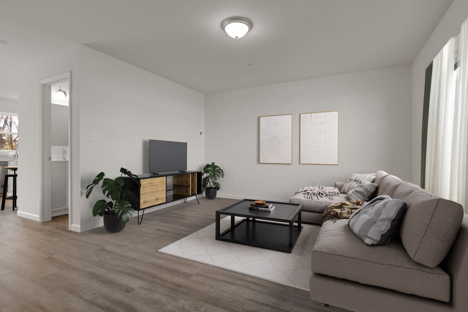 Modern vinyl plank flooring in the entry, kitchen, bathroom, and laundry room